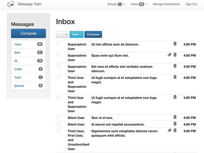 MessageTrain is a Rails 4 and 5 Private Messaging Gem that uses bootstrap to send and display private messages from one user to another. It can also be configured to send messages to a user collective (such as a certain Role or Group of users).
